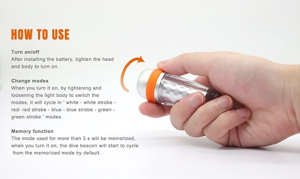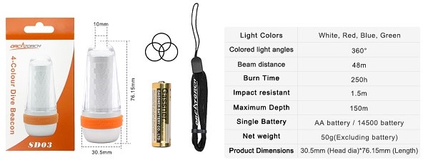 The OrcaTorch SD03 is a compact and multifunctional 4-colour dive beacon. It can emit light in 4 different colours and has 8 lighting modes: for each colour either constant light or flashing mode. Both colour and light mode can be chosen by rotating the body. The SD03 can be used as an underwater or outdoor signal light, dive backup light, outdoor regular light, etc. Its shell is made of plastic which provides good light penetration. With excellent waterproofness, it will function up to 100m underwater. There is no doubt that the SD03 is one of the best choices for diving or outdoor lighting.